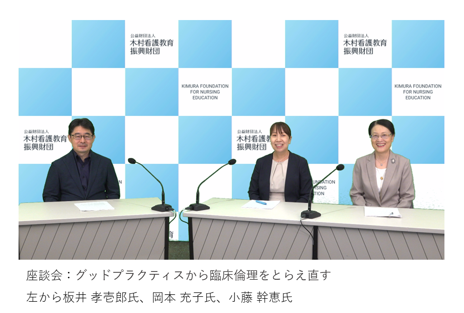 本講演では、まず財団についてご紹介した後、講演1は、医療倫理学の専門家である宮崎大学医学部教授の板井孝壱郎氏に、臨床倫理の基本的な考え方や組織的なアプローチについて語っていただきました。講演2は、社会医療法人近森会理事・統括看護部長の岡本充子氏から、臨床倫理に関する組織的活動及び臨床倫理における課題への具体的な取り組みについてお話しいただきました。講演3は、前石川県看護協会会長の小藤幹恵氏に、どのようにして臨床倫理を中心に据えた看護実践を根付かせてきたのかを具体的事例に基づきお話いただいております。座談会では、板井先生に座長をお願いし、3名のご講演者のご見識とご経験に基づく臨床倫理のとらえ直し方について貴重なご議論をいただきました。